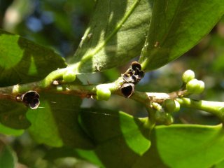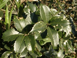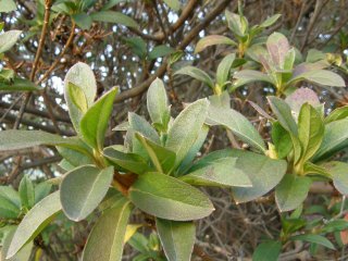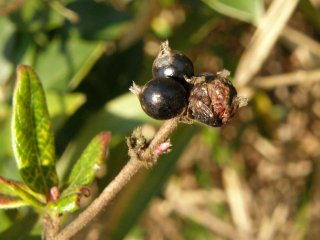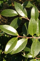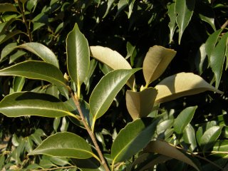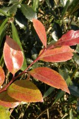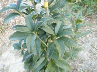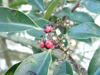 【左】これはヤマモモで雌木と雄木は別です。  【右】これはクロガネモチです。若い枝がクロガネ色(鉄色)しているところかの名前です