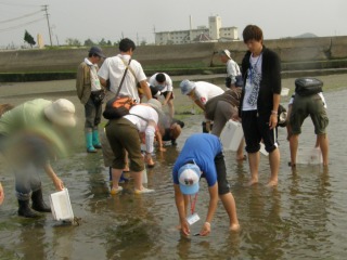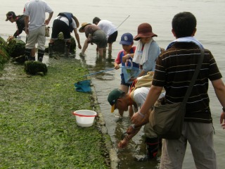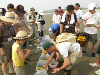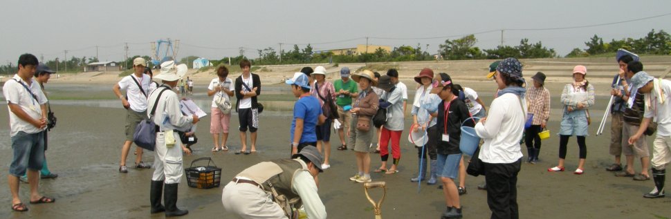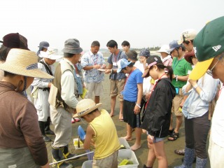 日本福祉大学生涯学習センターの企画で毎年計画されている講座です。目的は、家族そろって参加していただき、身近な自然である海辺に出て、海辺の生き物を観察することにより自然の大切さを知り、自然を守っていく心を育てるためです。単に生き物の名前を知るだけではなく生き物に触れ親しみながらその生活を知ることです。
