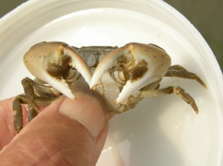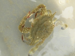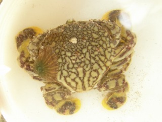 【右】アミメキンセンガニ。背中にタテジマイソギンチャク