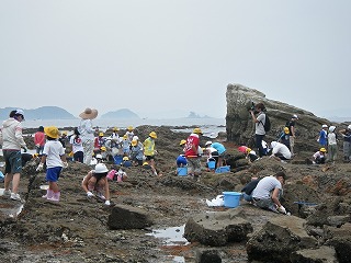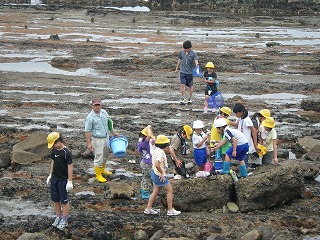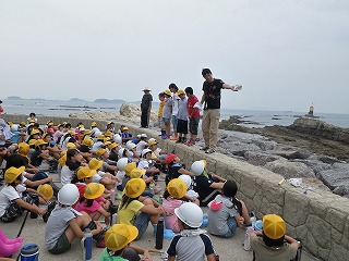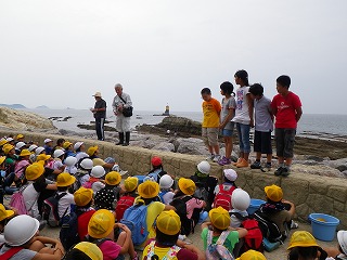 児童たちは例年の開催を楽しみにしており、元気な笑顔が講師陣もワクワクさせてくれる学校行事です。今年は教室で「海の学習会」を45分程実施し、10時頃から海岸へ出て自然観察会に臨みました。八つのグループに分かれた児童たちは、熊手やたもなどを手に潮だまりをのぞき込み、カニやウニ、ナマコなどを次々に見つけました。はさみを振りかざした大きなイシガニが採れたときは歓声をあげていました。また、終了間際にはドチザメが採集され、閉会行事のスターになりました。当日は朝から風がやや強く、昼からにわか雨の予報が出ていましたので、午後からの海岸清掃予定は中止し帰途につきました。(記・森田琢)