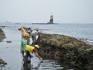 「海に親しむ会」は @ 地域の自然、海辺に棲む生き物に親しむ活動を通して、環境保護について考えるとともに、自然豊かな郷土を愛する心豊かな児童を育てる。Aなかよし班での活動を通して、学年の枠を越えた人間関係を育てる。を目的にしています。