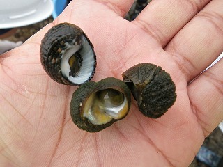 【右】スガイ (貝表面の緑藻はカイゴロモ)