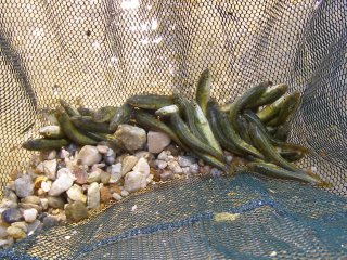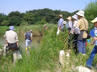 【左】外来魚のカムルチーの稚魚の群れを採集。
