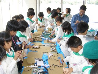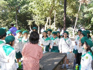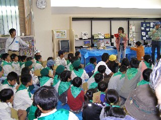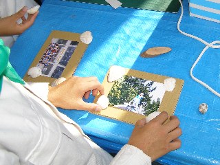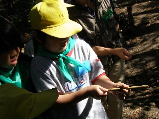 【右】午後の部が始まりました。自然物の工作の説明をしています。