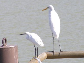 【右】コサギ、ダイサギ、噴水をバックに記念撮影。