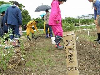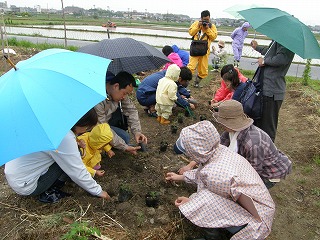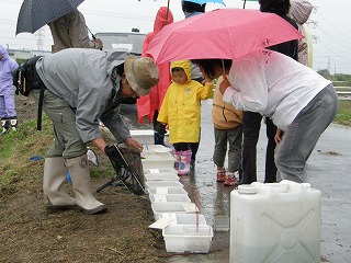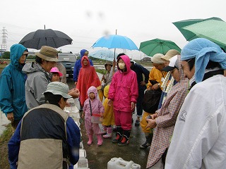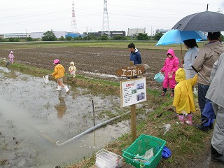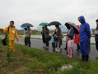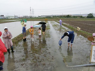 「なごや環境大学 連携講座」として募集した「田んぼの学校エコたん」講座の一齣として「田んぼの生き物を探してみよう!」に協力をしました。「田んぼの学校エコたん」は田んぼを耕さずに、生き物との共同作業で肥料も農薬もなしに安全・安心なお米づくりをすることを目指しています。田んぼに農薬を使用しないと害虫もたくさん発生します。しかし、害虫だけが田んぼで生活するのではなく、害虫を食べる食べる益虫もたくさん発生します。害虫がたくさん発生し稲が無くなれば害虫も生活できなくなります。害虫がいなくなれば害虫を食べる益虫も生活できなくなります。田んぼには人間にとって益虫も、害虫も、関係ない虫もつりあいよく生活し、稲とともに豊に生活をしているのです。そんな様子の一部を少雨の中、楽しく観察しました。
