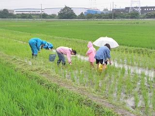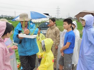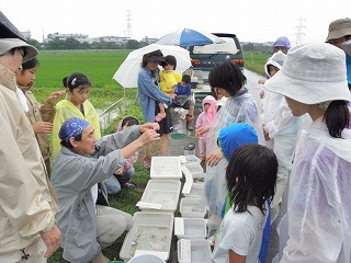 梅雨らしく朝から小雨が降っていましたが参加者は一人としてやわな顔せず笑顔で楽しみにしていました。。エコたんで取り組んでいる水田は農薬を使っていませんので色々な生き物が生活しているはずです。早速、簡単な開会式を行ってから水田に入りました。生き物が安心して生活できっるよう水田の真ん中に少し深い水路が掘ってあります。子供たちはよく心得ていて次々魚や水生昆虫を捕獲してきました。今年の水田は雑草がたくさん茂っていました。今年は稲を植えてから水不足に陥り水田が一時干上がったみたいで雑草がたくさん見られました。稲の栽培にはマイナスですが生き物が快適に生きていくためには隠れ家としてとして有効見たいだした。(記・降幡)