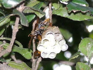 【左】巣の育房のキャップが黄色をしているのでヤマトアシナガバチみたいです。