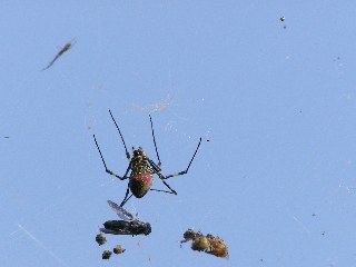 【左】大きいのがジョロウグモの雌。左上が雄。右上がシロカネイソウロウグモ。