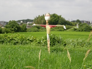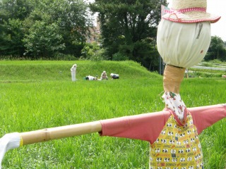 【左】どんな生き物が採れたでしょうか。 【右】「カカシ君の水田」の案山子(かかし)