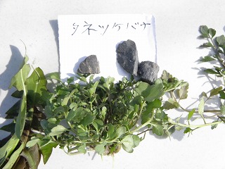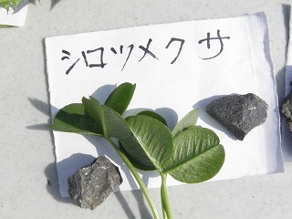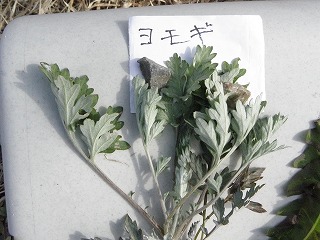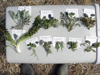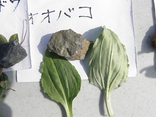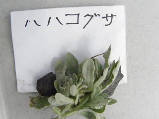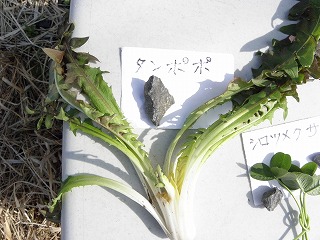 【左】ハハコグサに似たウラジロチチコグサ(外来) 【中】コオニタビラコ(七草のホトケノザ。水田圃場整備後、少なくなった) 【右】かかし君の水田近くで採った食べられる野草