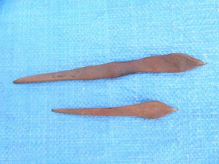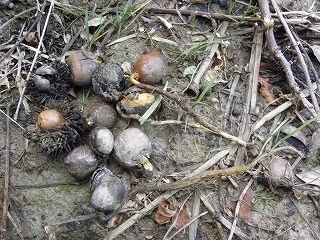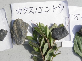 【左】フジの種 【中】水田に落ちたドングリから出た根 【右】クサギの葉痕