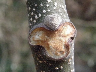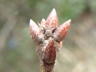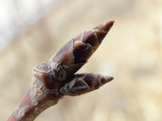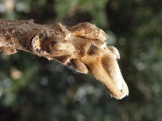 【左】何かに似ているハゼの冬芽 【中】コナラの冬芽 【右】ヤマザクラの冬芽