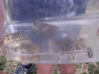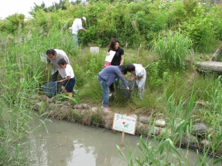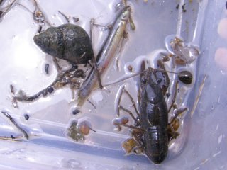 【左】ドジョウ、アメリカザリガニ、シオカラトンボのヤゴ、サカマキガイが見られました。