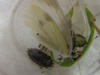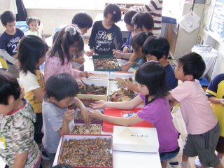 【左】ザリガニのお母さんを観察しています。 【右】毛虫に触ってみてください。