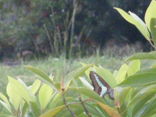 【右】タブノキにアオスジアゲハやってきました。卵を産んでいるのでしょうか。