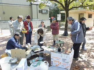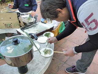 【左】タンポポコーヒーの調理中 【中】テンプラも始まりました。 【右】お好みのものを頂きました。
