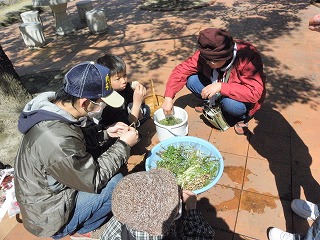 【左】レンゲ摘み 【中】水路にセリが生えていました。 【右】食材の野草を整理しています。