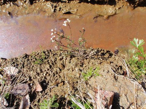 【左】周りは山に囲まれたのどかな場所でした。 【右】春の七草、コニタビラコを観察