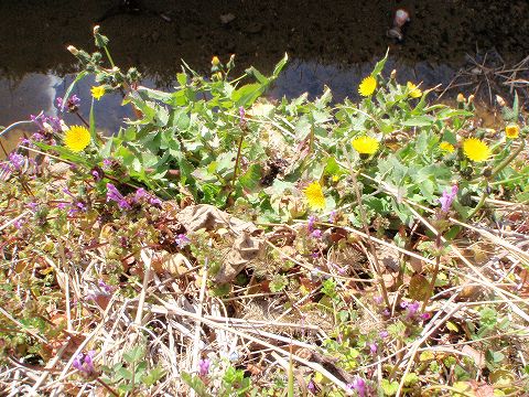 レンゲ、セリ、タンポポ、ナズナ、コオニタビラコ(春の七草のホトケノザ)、スギナ、カラスノエンドウ、コハコベ、コスミレ、ヤブタビラコ、ノビル、スイバ、】ガマ、オオイヌノフグリ、ハルジョオン、カキドウシ、トキワハゼ、ハルノノゲシ、オニタビラコ 、ヨモギ 、セイヨウカラシナ、ハハコグサ 、オオバコ、シロツメクサ、タネツケバナ、ギシギシ、ホトケノザ、タガラシ