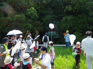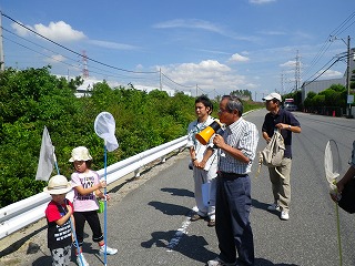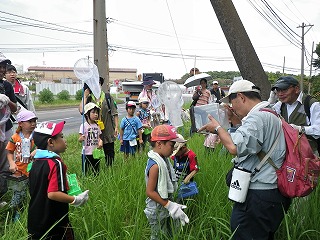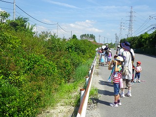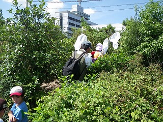 「南柴田緑地」では灌木・低木群落形成途上の植樹林の沿道で市職員から植樹の理念や方法を説明して頂き、さらに30分ほど歩きながら昆虫採集を楽しみました。短時間でしたので子ども達が採集できた昆虫はシオカラトンボとオオスカシバのみでした。