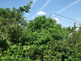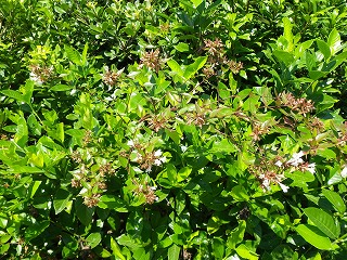 【左】オオスカシバが飛来する低木:スイカズラ科アベリア   【中】低木:マサキ   【右】高木:クスノキ