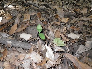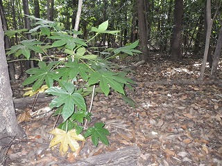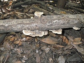 【左】菌類のカワラタケ   【中】林床での発芽   【右】林床低木:ウコギ科ヤツデ