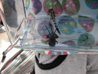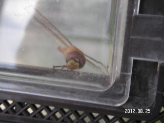【左】ウスバキトンボ(林縁で見つかりました)   【中】シオカラトンボ(上)とオオシオカラトンボ(下)    【右】セボシクサカゲロウ(林内で見つけました)