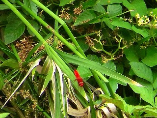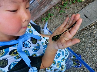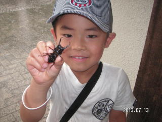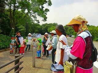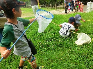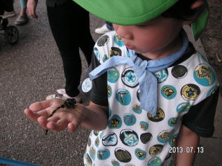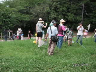 前日の下見では、オオシオカラトンボとアオスジアゲハぐらいしか見かけず、セミも鳴いていないので、大変心配しました。 当日は好天に恵まれ、セミは元気良く鳴き、バッタも沢山いました。観察会日和で、始めに、一人がコクワガタを見つけ、 子供達は大喜び!急に皆やる気満々となり、お手伝いをしている私たちまで楽しくなりました。 全員が何かを捕まえて満足していたのが、何よりすばらしいことです。また、弱ったオニヤンマを見つけた子が手のひらに 乗せて、みんなでじっくりと観察することが出来ました。オニヤンマは日頃逃げ足が速く、高いところにしか飛んでいないので、 初めての経験の子が多かったです。暑さを忘れ飛び回っていましたが、分かち合いの時に、急に雷が鳴り、強い雨が降りだし、 雨宿りの場所まで急行しました。親さんも子供達も一生懸命で楽しい観察会でした。(記:吉房)