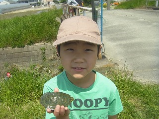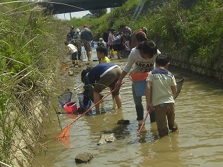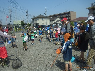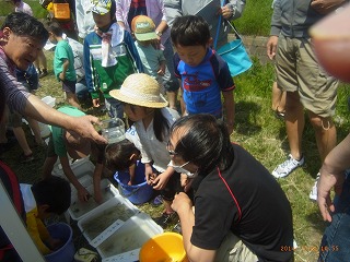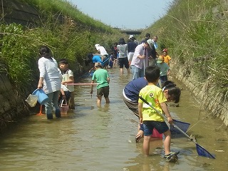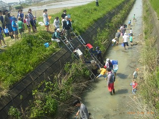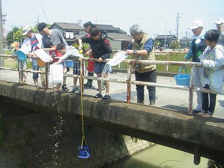 昨年は雨で中止になりましたが今年は好天に恵まれ良好な観察日和になりました。東海市養父保育園に集合し、最初に日程、諸注意と本日の見どころをお話をして川に移動しました。観察場所には「危険近づくな」の看板がある場所です。危機の時の対処訓練を兼ね、コンクリート高い土手を梯子を使いおりました。子供たちにはいい体験になったと思います。川は田植えの時期で代掻きの影響で濁っていましが、たくさんの生き物を確認することが出来、家族で楽しく生き物と触れ合うことが出来ました。(記・降幡 )