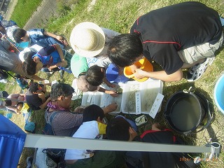 【左】どんな生き物が居たか分かち合い 【中】生き物の紹介 【右】最後に川に放しました。さよなら