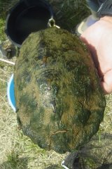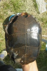 【左】イシガメの背中と腹(在来) 【中】アカミミガメ(外来)得意になり喜んでいるがお呼びでないカメさん 【右】アオダイショウも参加