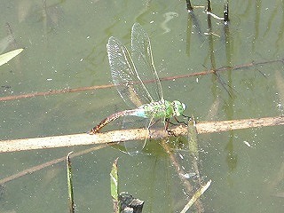 【左】シオカラトンボとヒナバッタ 【中】オオシオカラトンボ(ビオトープ) 【右】ギンヤンマ(観察池)