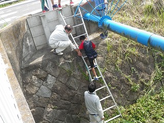 【左】ECOスクール開会、諸注意 【右】脚立階段で川へ降下