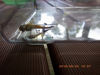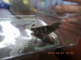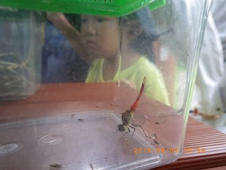 【左】みんなで捕らまえた無史さんの説明をします。 【中】ウスバキトンボ 【右】クルマバッタモドキ