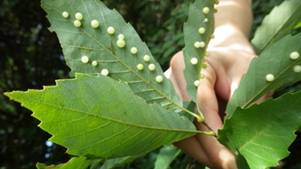 御雉山への観察路 ムシさんいるかな コナラの葉裏に産み付けられた卵