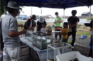 今年も捕らまえられた川の生き物を、家族グループでミニ水族館を広くかこみ、分かち合いを行いました。今年も参加された皆さんが熱心にこの川の生き物を観察されて、有意義なものになりました。(記:南川)