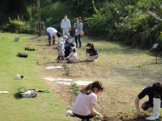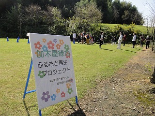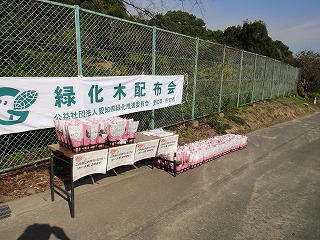 【左】会場設営 【中】緑化(バラ)木頒布会会場 【右】ふるさと再生プロジェクト看板