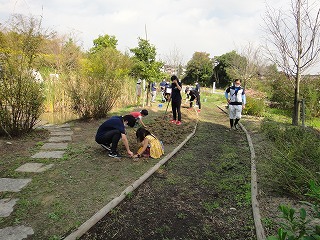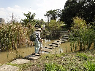 【左】水辺は退屈 【中】春の七草 植栽 【右】池の飛び石を渡る