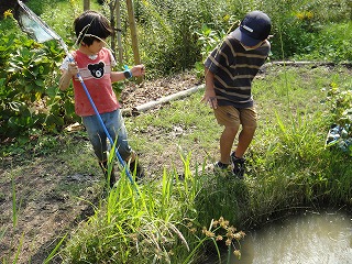 【左】水辺でザリガニ捕り 【中】カナヘビ見つけた 【右】池の生きものあれこれ