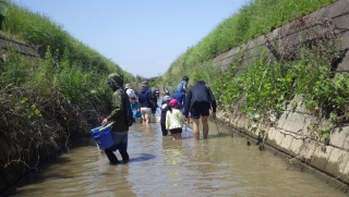 川の堤から梯子使いまず安全に川に入る。親御さんと子供たちがタモやバケツを思い思い手にして、川の中をガサガサと川の生き物を求め活動し、サカナや生き物がタモには入ると感激や感性の声をあげて嬉しそうに楽しんでいました。