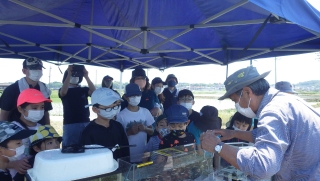 【左】今回もウナギが捕れました。     【右】捕らえた生き物を説明しています。