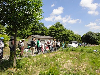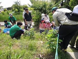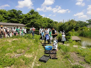 【内 容】5月5日下見実施。長谷川明子講師が企画されたイベント構成の下で全体進行。芝生広場で応募参加者を9時から受付け、7家族編成。9時40分からアンバサダー川崎郁美さんのアナウンスで開会。主催者挨拶、スタッフ紹介の後、長谷川講師による「生きもの体操」を実施(約15分)。10時00分、参加家族をポット苗づくり会場に移動させ講師陣のガイドの下で、フジバカマの差し芽づくりを実施した。次いでヘイケボタル幼虫の観察と放流会場に移り、知多自然観察会講師のガイドで幼虫放流を実施した。再びポット苗づくり会場に戻り差し目をポットに植えた。ポット苗は水やりの後、根が生えるまで育苗され、秋のイベントで植栽される。11時30分にイベントを終了し、振り返りの後解散した。