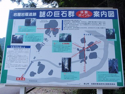 【左】遺跡の案内図  【右】前方の車の右の高い木の下に見つけた