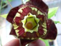 それにしても、開花したばかりの花のめしべについていた粉は花粉だったのか。おしべは確かに5本ある。葯もある。開花したときは、その葯には花粉が殆ど無い。ということで、開花前の蕾を割ってみる。そこには細かい毛の生えたワイングラスと、それを取りまくおしべの葯が出てきた。つまり、葯は開花以前に熟し、めしべに付着する。そのとき、柱頭部分はグラスの内側になっていて、花粉はつかない。柱頭がラッパのようになったとき、柱頭に花粉が着く。と推察する。背中に白い粉をつけたスズメバチが花冠にもぐりこんでいる。これって、自家受粉を避けるのに役に立つ????