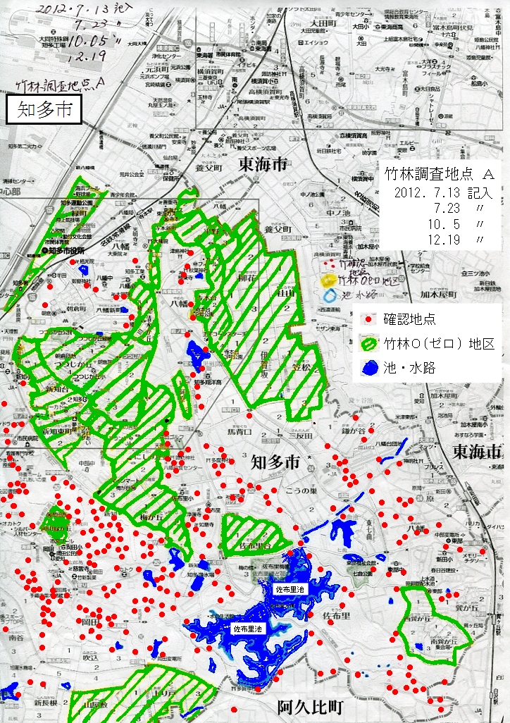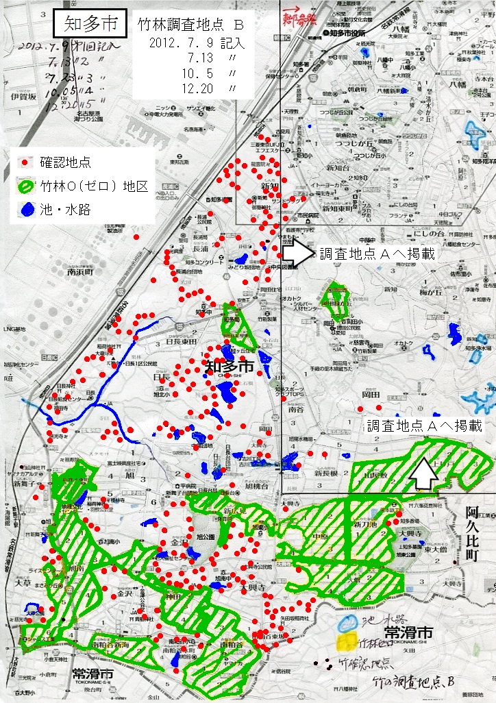 知多ブロックの会員大野氏が2012年5月〜12月にかけ多大な時間を費やし精力的に知多市内の竹林の所在を確認しました。