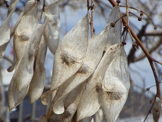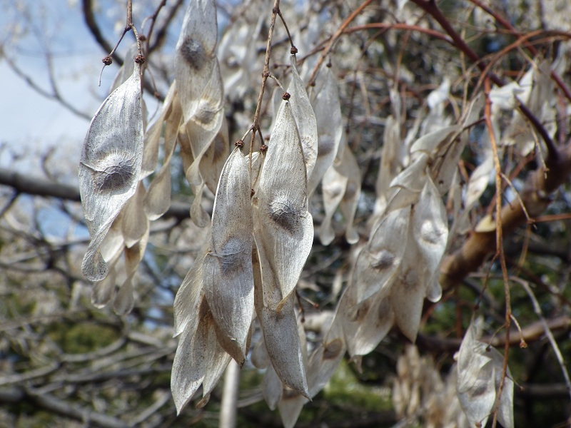 館を出てから、その木の近くに行って見たら、“花”ではなく“種子(翼果)”だった。それを拾って、帰宅後、その種子が何の木なのかネットでチェックしたところ、「シンジュ(ニワウルシ)」であった。ニワウルシは知多半島にも野生の幼木があり見たこともあるがこのような姿は初めてだったので本日(2013.2.27)ここに紹介することにしました。