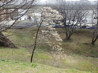 過日(2013.2.17)ヤボ用で愛知県図書館に行ったとき、玄関近くの国道沿いや堀の土手下に“白い花?”を満開にした木があったので(写真参照)、館内の受付でその木の名前を聞いたところ、そこでは、判らなかった。