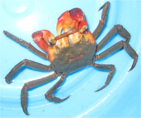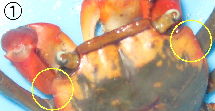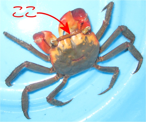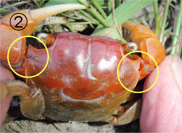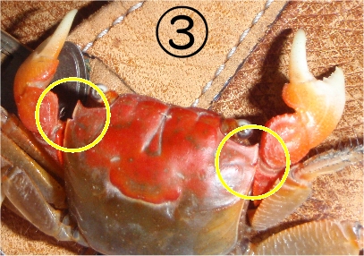 手元の図鑑によると、この部分が直線的だと「アカテガニ」とある。