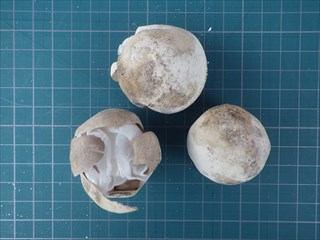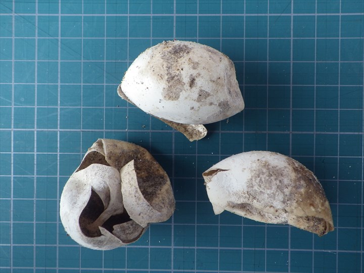 【左・中】孵化した卵の殻を3つ、取り出して撮影 【右】同左の卵の殻にティッシュペーパーを詰めて撮影したもの